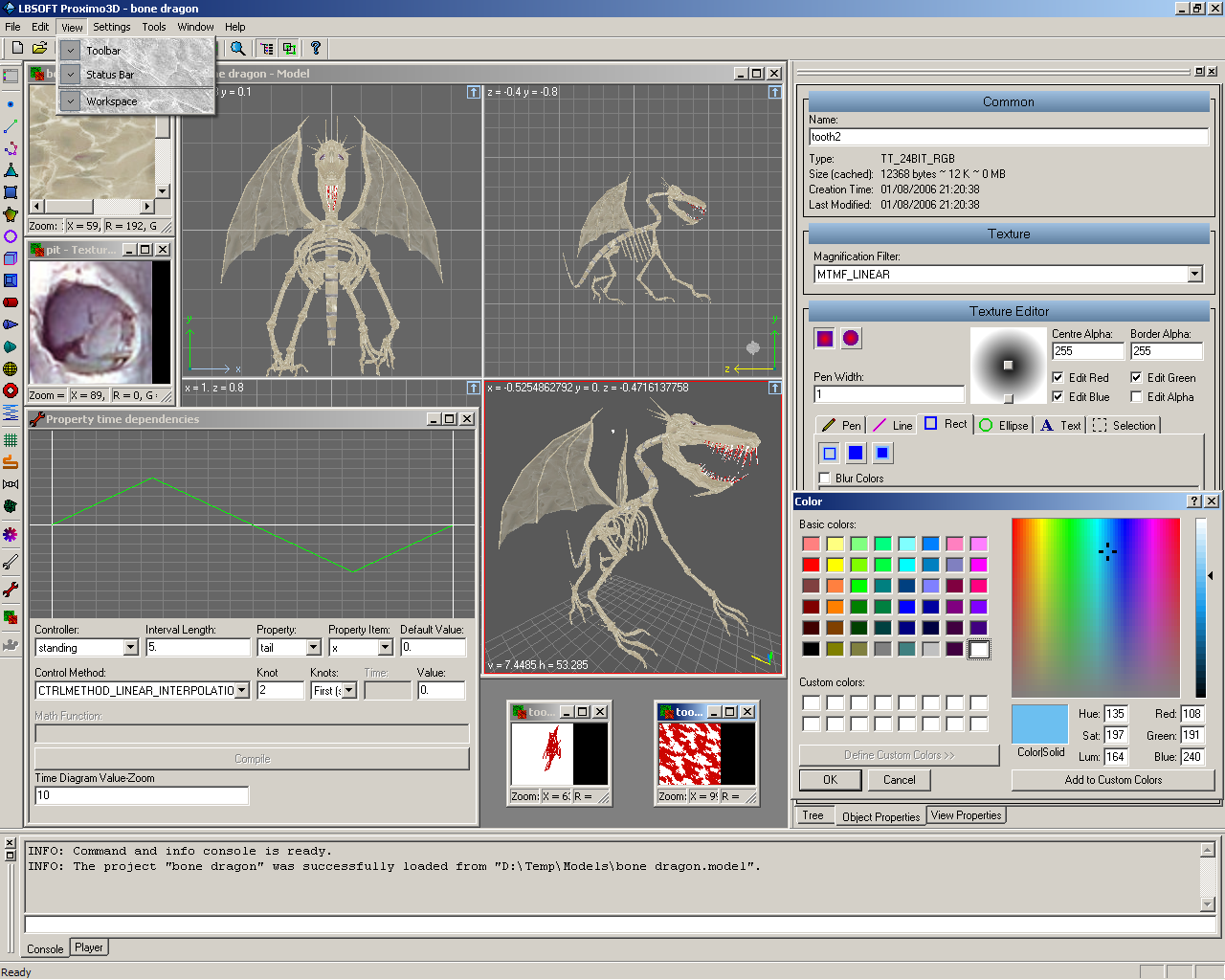 Proximo3D also contains built-in texture editor which allows textures to be adjusted. There is also "advanced" texture editor which allows the texture data to be changed programmatically.
