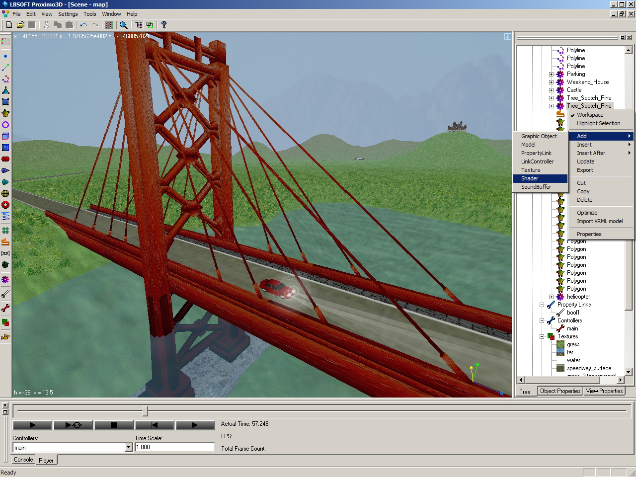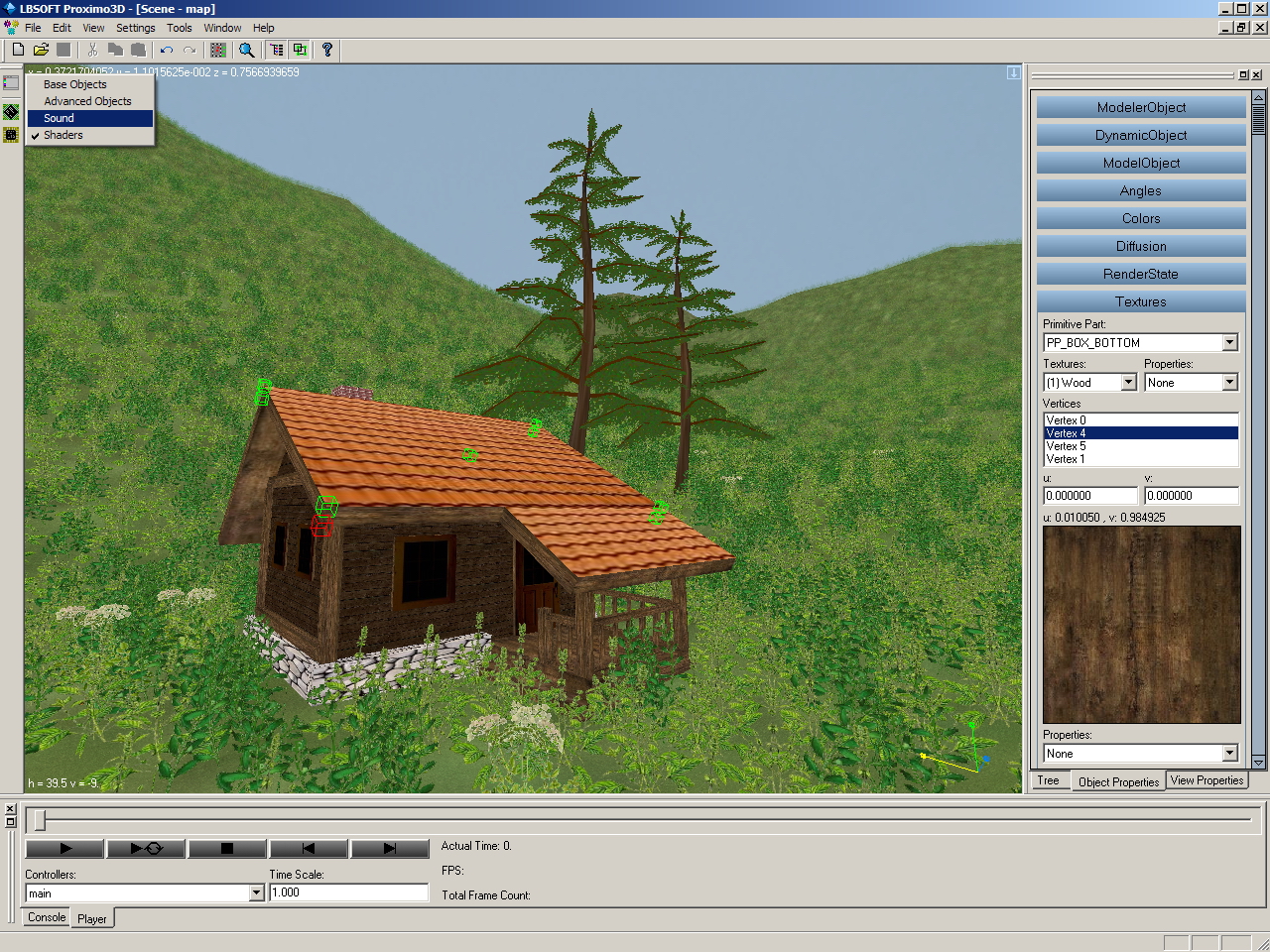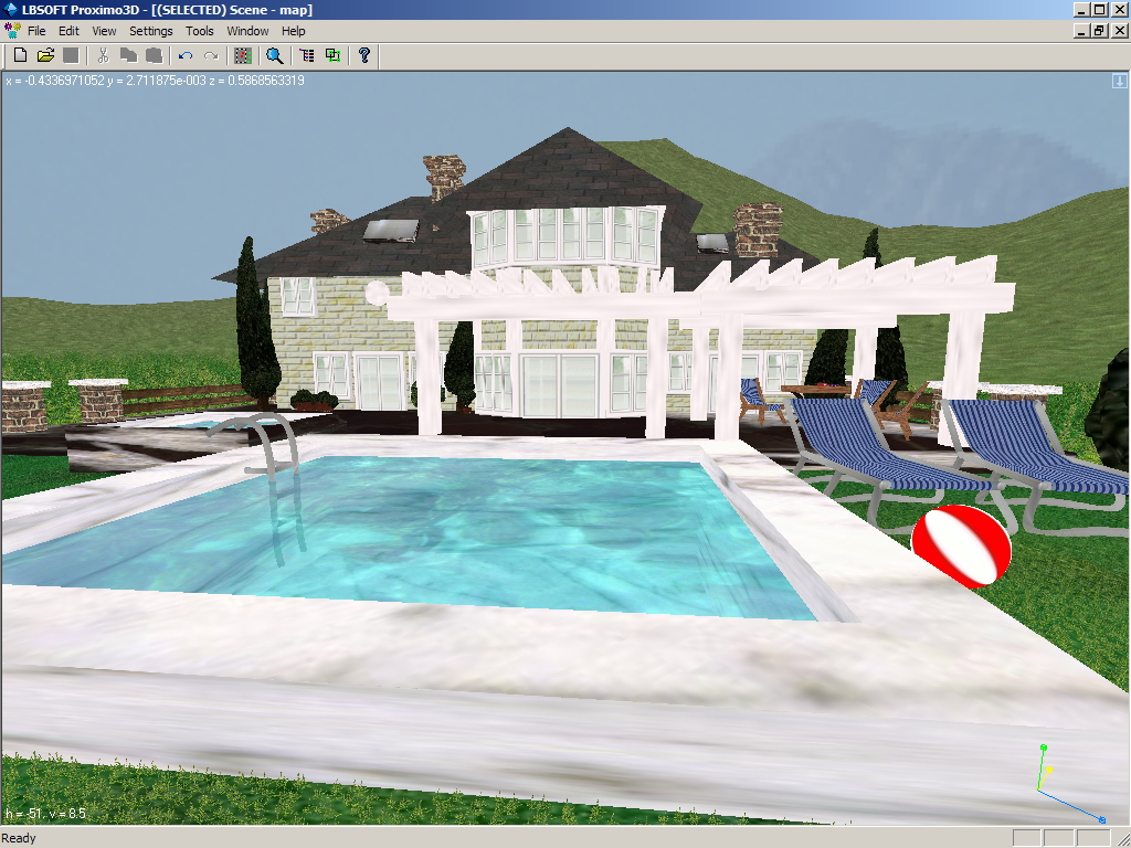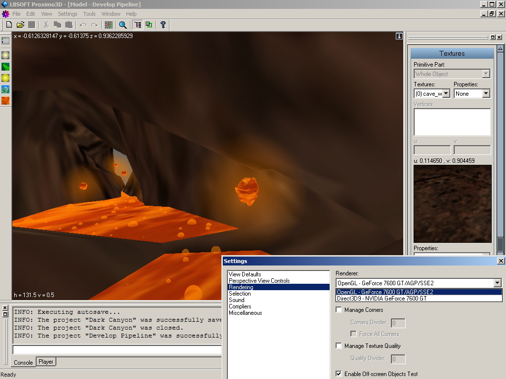 Proximo3D also supports effects like glares, lightmaps, light-cones, liquid (bubbles and erruption). Those objects can be also animated and have many properties that can be adjusted to achieve the desired visual appearance.