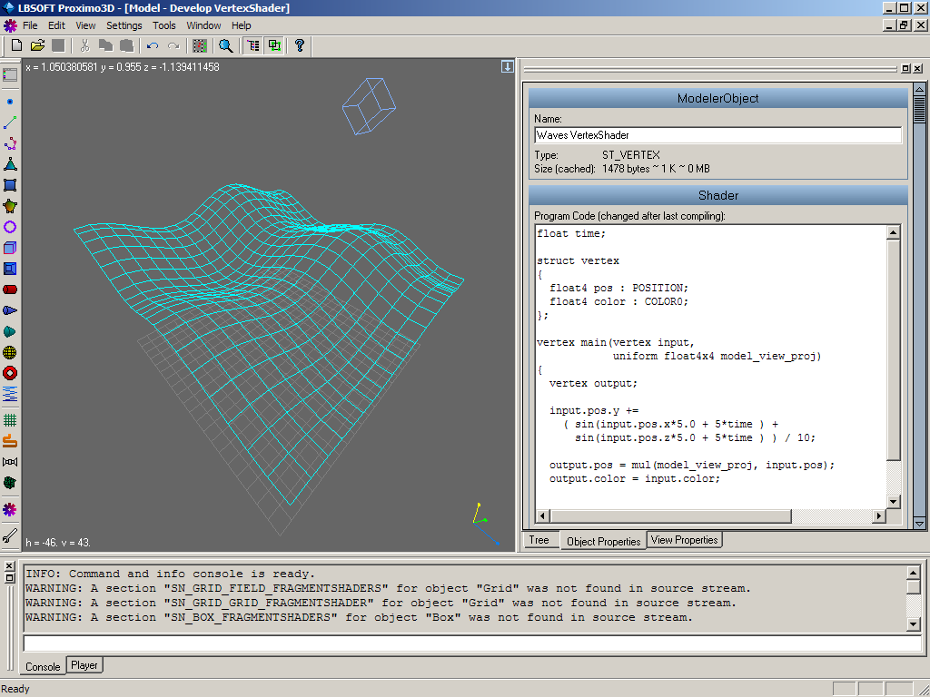 Proximo3D also supports vertex and fragment shaders using NVIDIA Cg. It is very useful to calculate moving